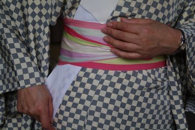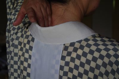 背中心が、文字どうり、背筋が通っているかのように、襦袢がスッキリとなるようにしてください。ここがだぶついていると、ゴロゴロとして、着物が収まりません。着物をきれいに着ても、中から崩れてきます。スッキッと、シャッと。